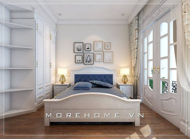 Trang trí nội thất phòng ngủ tân cổ điển sang trọng, thông thoáng với hệ cửa đầu giường giúp không gian luôn được thông thoáng.