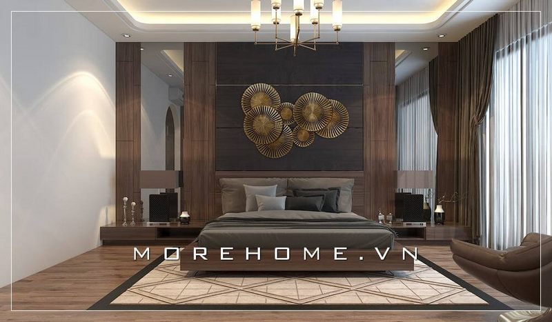 . Giường ngủ hiện đại trong căn hộ đầy ấn tượng, với tone màu nâu cánh gián làm chủ đạo cùng với nội thất khác tạo nên sự liên mạch trong không gian nghỉ ngơi.